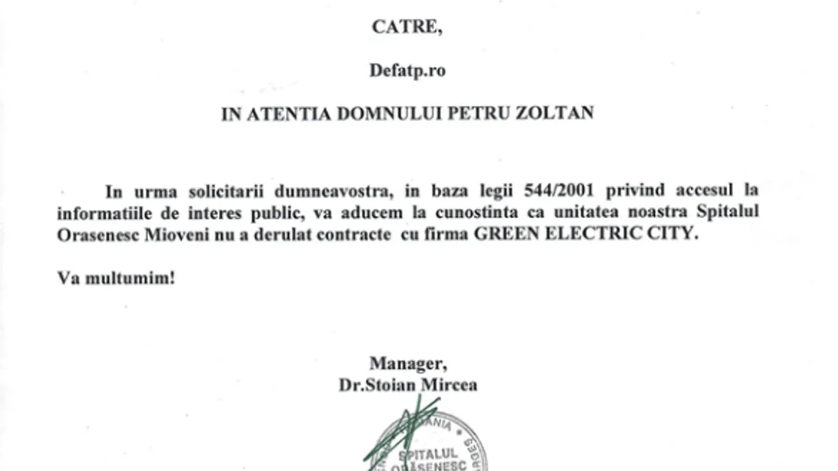 Medicul Mircea Stoian, managerul Spitalului Orășenesc Mioveni (cel mai nou din țară) a transmis la solicitarea Defapt.ro că „Spitalul Orășenesc Mioveni nu a derulat contracte cu firma Green Electric City”.