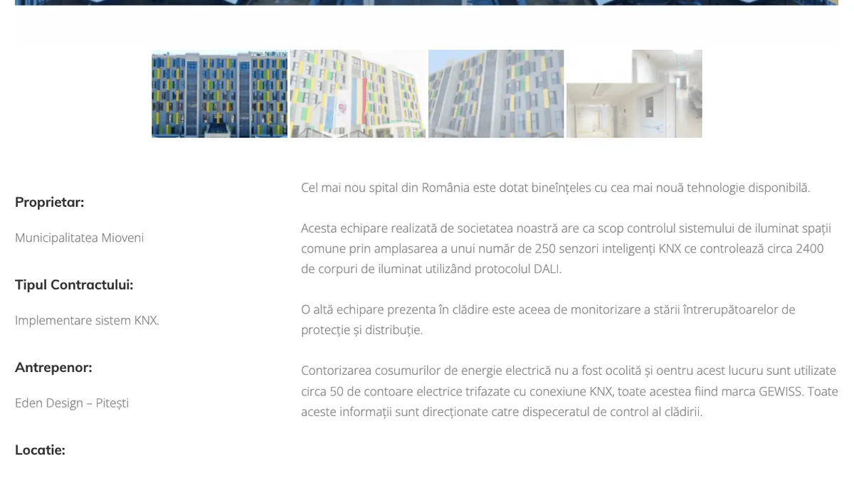 „Cel mai nou spital din România este dotat bineînțeles cu cea mai nouă tehnologie disponibilă. Acesta echipare realizată de societatea noastră are ca scop controlul sistemului de iluminat spații comune prin amplasarea a unui număr de 250 senzori inteligenți KNX ce controlează circa 2400 de corpuri de iluminat utilizând protocolul DALI.