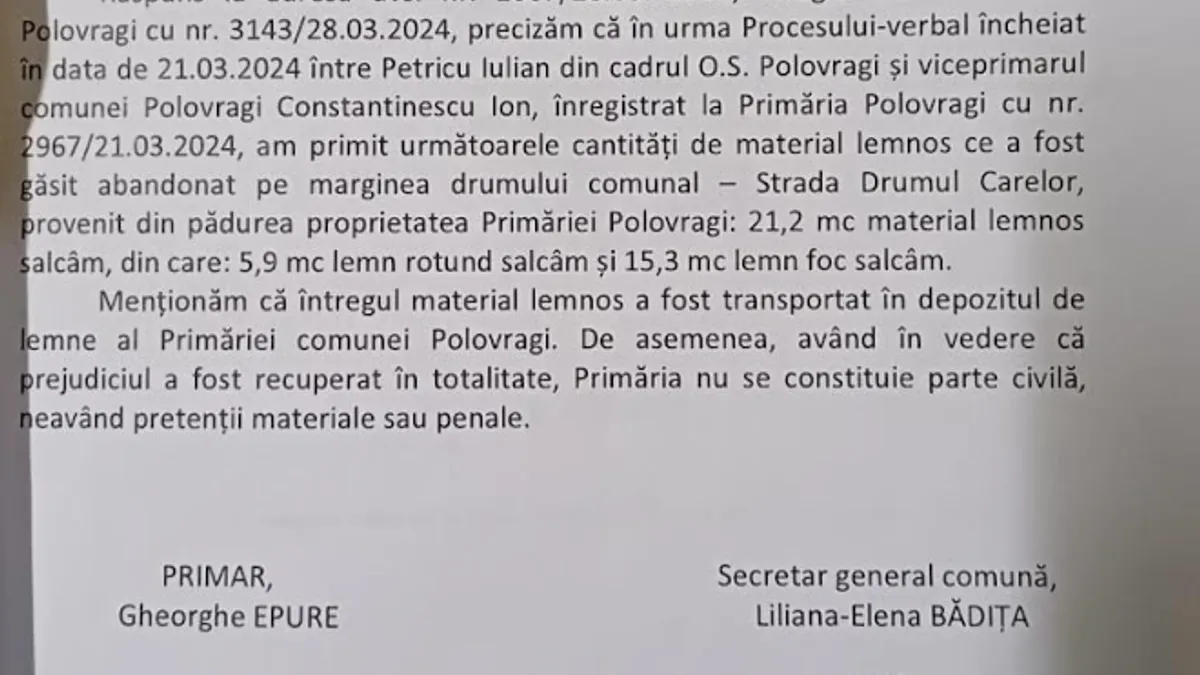 "Menționăm că întregul material lemnos a fost transportat în depozitul de lemne al Primăriei comunei Polovragi (administrat de Ocolul Silvic - n.r.).