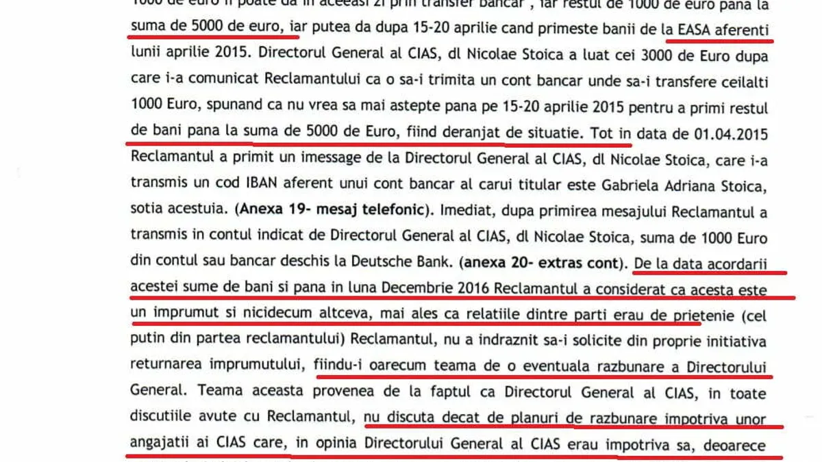 Tot atunci, Florian i-ar fi spus șefului CIAS că urmează să îi mai dea 1.000 de euro prin transfer bancar. Iar diferența, după două săptămâni, când urma să îi intre salariul de la EASA. Nicolae Stoica i-a trimis contul Gabrielei Adriana Stoica, soția lui de atunci, pentru a i se vira mia de euro.