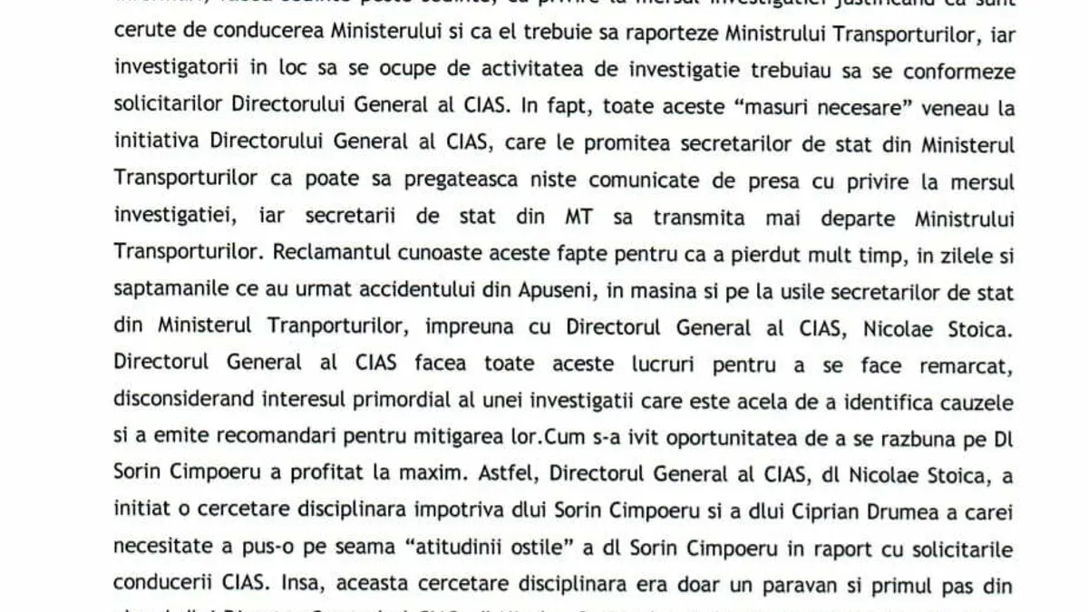 În documentele depuse pentru judecată, Florian a livrat o întreagă spovedanie. Din hârtii rezultă că Ionuț Daniel Florian a primit un e-mail de la Ștefan Ioan, angajat la resurse umane CIAS, prin care i se solicita să renunțe la funcția de șef birou ECCAIRS în cadrul Serviciului Analiză și Reglementări pentru a ocupa funcția de inspector aeronautic.
