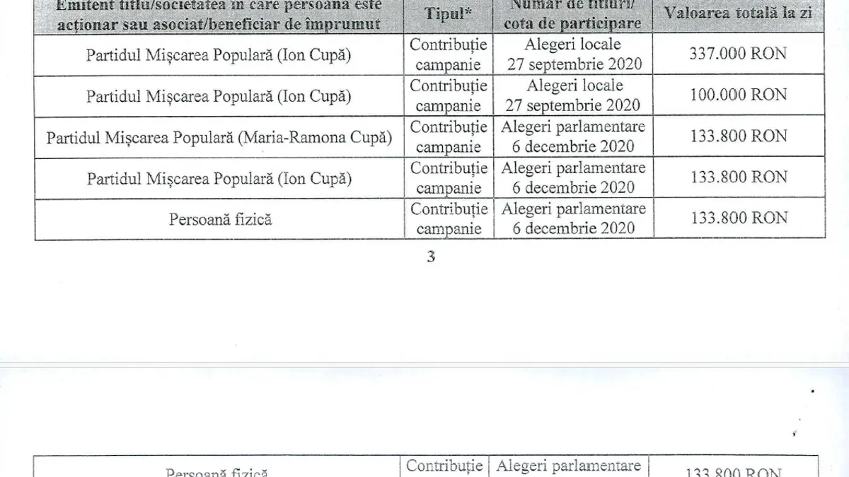 Ce nu a menționat Ion Cupă în declarația sa de avere este faptul că și soția lui, Ramona Maria Cupă, a contribuit la campania electorală cu alți 150.000 de lei.