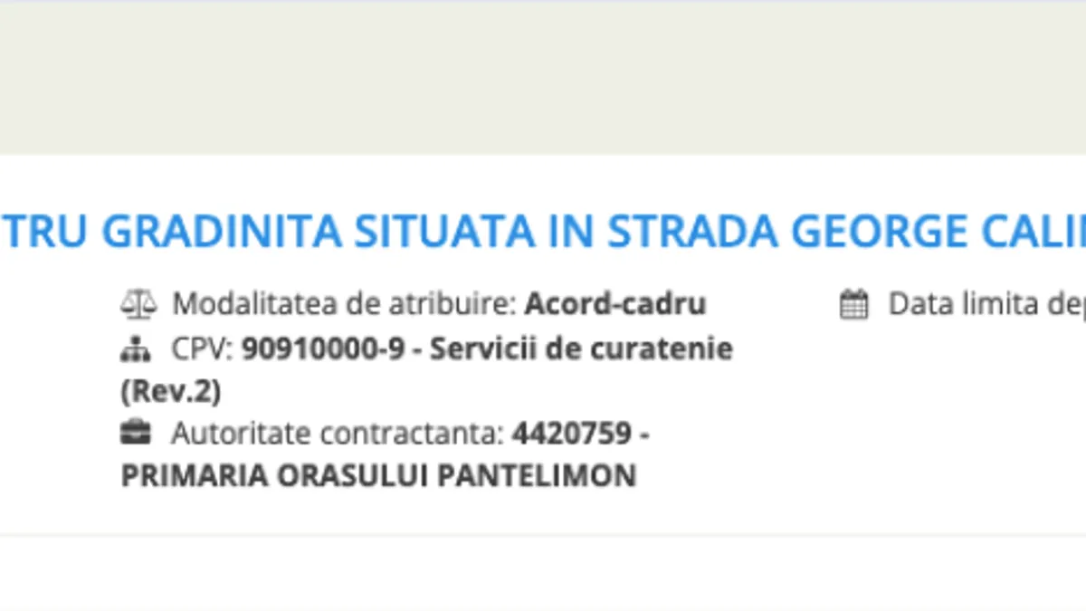 "Pe parcursul perioadei de derulare a acordului-cadru, autoritatea contractantă intentionează să atribuire contracte subsecvente pentru servicii de curățenie pentru gradinița situată în strada George Calinescu, nr. 51, Oras Pantelimon, județ Ilfov. Acordul cadru fiind de complexitate mică se va semna cu 1 operator economic, oferta câştigătoare fiind cea de pe primul loc", se menționeză în anunțul primăriei.