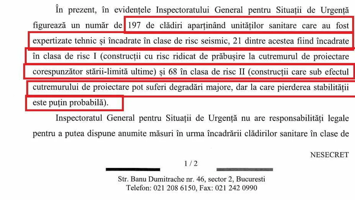 „În prezent, în evidențele Inspectoratului pentru Situații de Urgență figurează un număr de 197 de clădiri aparținând unităților sanitare care au fost expertizate tehnic și încadrate în clase de risc seismic, 21 dintre acestea fiind încadrate în clasa de risc I (construcții cu risc ridicat de prăbușire la cutremurul de proiectare corespunzător stării-limită ultime) și 68 în clasa de risc II (construcții care sub efectul cutremurului de proiectare pot suferi degradări majore, dar la care pierderea stabilității este puțin probabilă)”, a transmis generalul Dan Paul Iamandi, șeful IGSU.