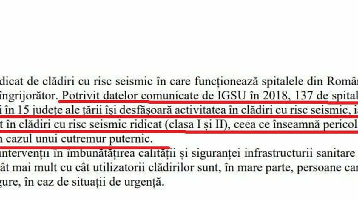 „Potrivit datelor comunicate de IGSU în 2018, 137 de spitale situate în București și în 15 județe ale țării își desfășoară activitatea în clădiri cu risc seismic, iar 37 dintre acestea sunt în clădiri cu risc seismic ridicat (clasa I și II), ceea ce înseamnă pericol iminent de prăbușire în cazul unui cutremur puternic. Nevoia de intervenții în îmbunătățirea calității și siguranței infrastructurii sanitare este așadar acută, cu atât mai mult cu cât utilizatorii clădirilor sunt, în mare parte, persoane care nu se pot evacua singure, în caz de situații de urgență”, se menționează în documentul aprobat de Bruxelles la cererea României.