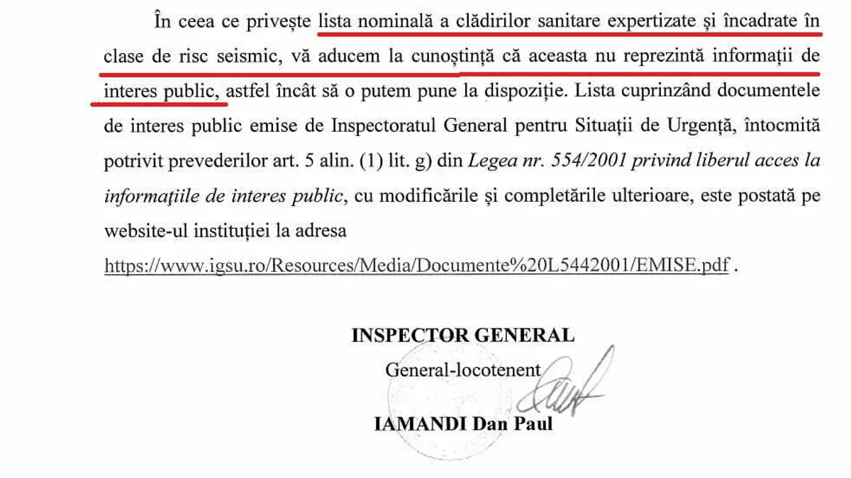Ceea ce nu spune spune generalul Dan Paul Iamandi este faptul că din comitetele pentru situații de urgență fac parte și reprezentanți ai IGSU. Cu toate acestea, Iamandi ține la secret lista spitalelor cu risc seismic pe motiv „că lista nominală a clădirilor sanitare expertizate și încadrate în clase de risc seismic (…) nu reprezintă informații de interes public, astfel încât să o putem pune la dispoziție”.