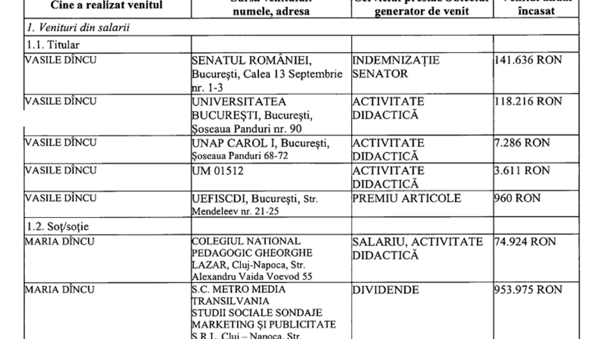 Potrivit declarației de avere depuse recent de Vasile Dîncu în calitate de candidat pentru un loc în Parlamentul European, soția sa a încasat anul trecut dividende de la Metro Media Transilvania de aproape 954.000 de lei.