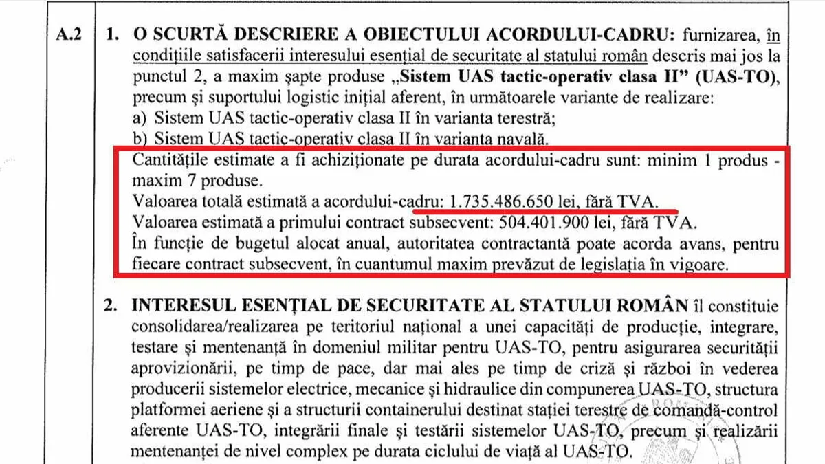 În documentul citat se menționează că interesul esenţial de securitate pentru statul român îl constituie „consolidarea/realizarea pe teritoriul naţional a unei capacităţi de producţie, integrare, testare şi mentenanţă în domeniul militar pentru UAS-TO, pentru asigurarea securităţii aprovizionării, pe timp de pace, dar mai ales pe timp de criză şi război, în vederea producerii sistemelor electrice, mecanice şi hidraulice din compunerea UAS-TO, structurii platformei aeriene şi a structurii containerului destinat staţiei terestre de comandă-control aferente UAS-TO, integrării finale şi testării sistemelor UAS-TO, precum şi realizării mentenanţei de nivel complex pe durata ciclului de viaţă al UAS-TO”.