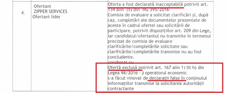 Totodată, oferta Zipper Services a fost exclusă „potrivit art. 167 alin 1) lit h) din Legea 98/2016 – operatorul economic s-a făcut vinovat de declarații false în conținutul informațiilor transmise la solicitarea autorității contractante”.