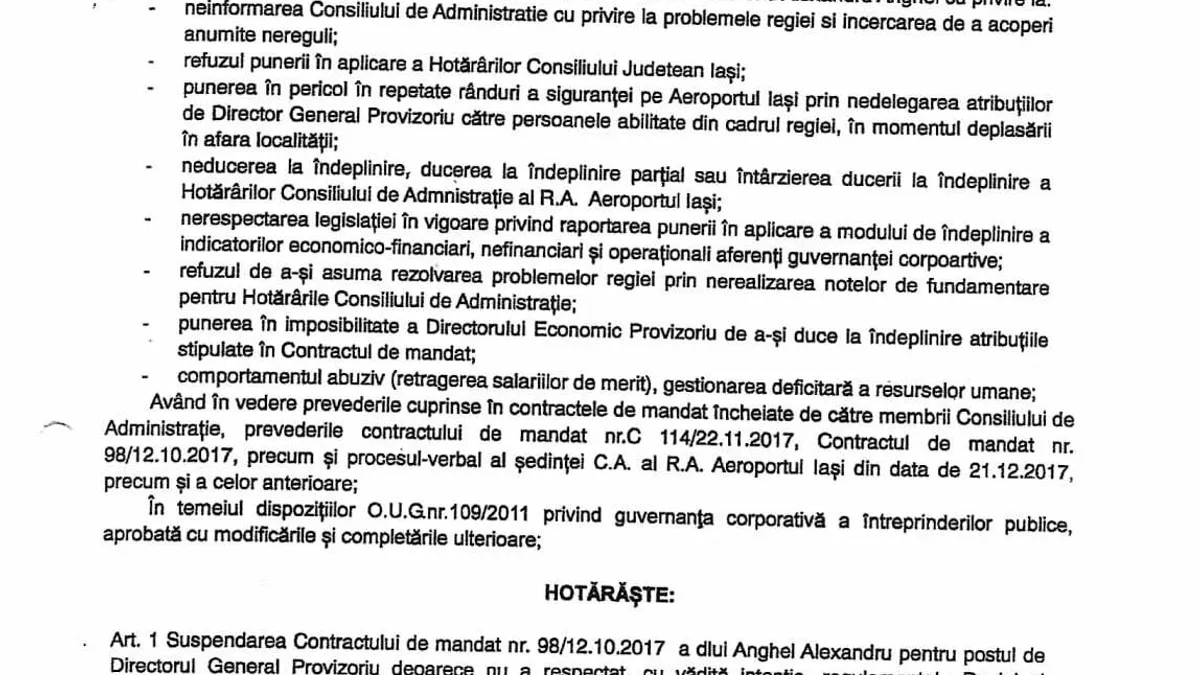 Totodată, Alexandru Anghel nu a informat Consiliul de Administrație cu privire la problemele cu care se confruntă Aeroportul Iași și nici nu a pus în aplicare hotărârile Consiliului Județean Iași, instituția care deține aeroportul.