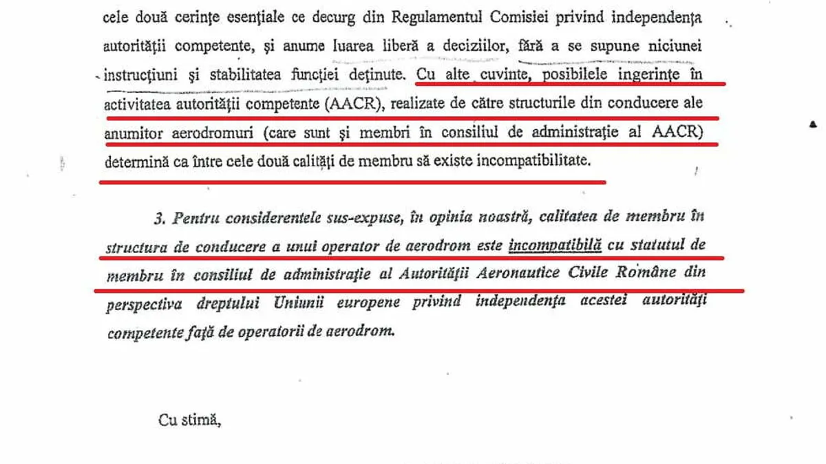 „În măsura în care membri din structurile de conducere a unor operatori de aerodrom sunt și membri în consiliul de administrație al autorității competente, este evident că aceștia pot influența deciziile privind certificarea și supravegherea acelor aerodromuri, spre exemplu prin numirea ca directori executivi a unor persoane care să se supună instrucțiunilor lor, prin amenințare cu revocarea din funcție etc.”, susțin juriștii ministerului.