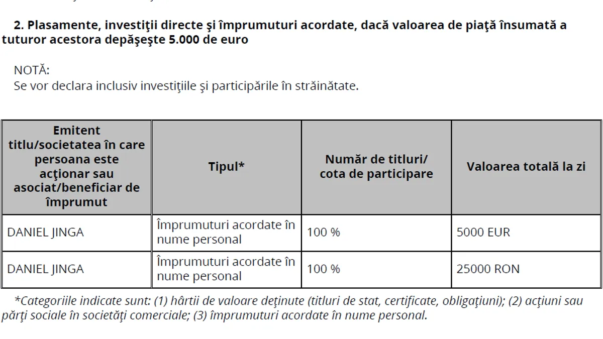 Noua subalternă a managerului Daniel Jinga i-a dat ulterior bani cu împrumut. De două ori. Prima dată, l-a împrumutat cu 5.000 de euro. Apoi, i-a mai dat încă 25.000 de lei, adică alți 5.000 de euro. În total 10.000 de euro. Subalterna a menționat împrumuturile în declarația ei de avere depusă în anul 2024 pentru anul 2023.