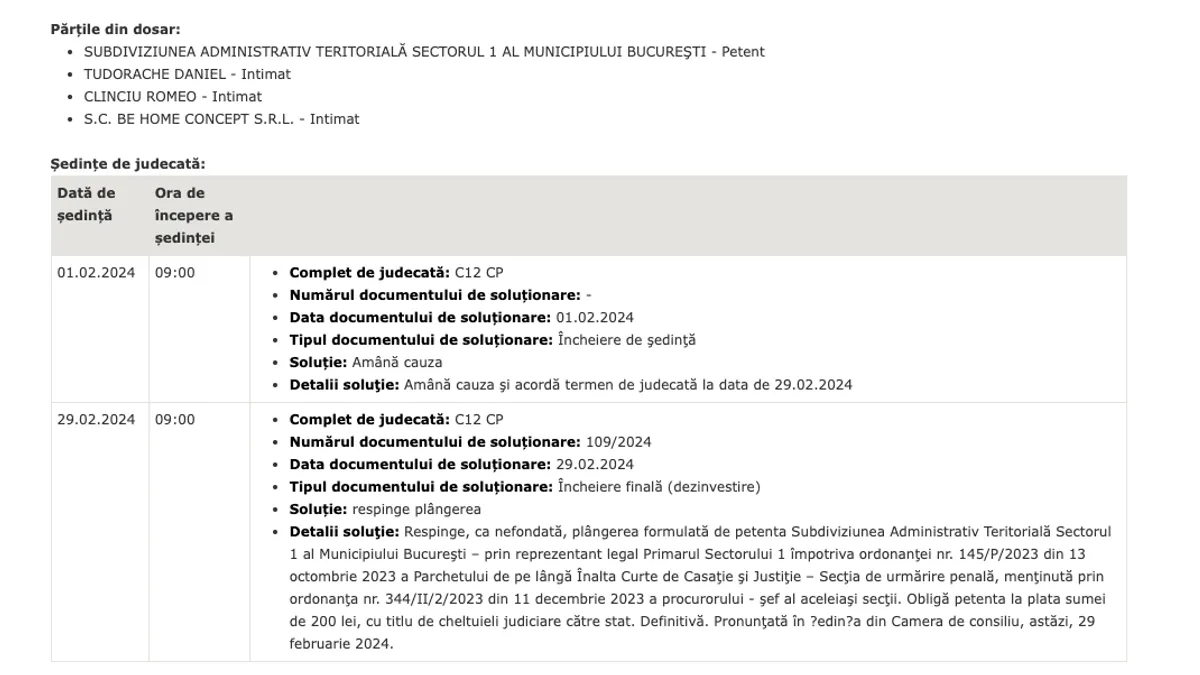 "După ce m-au târât prin toate parchetele, în final s-a dat clasare. Și după aceea au făcut contestație, cei de la Primăria Sectorului 1, la Înalta Curte. La Înalta Curte s-a menținut clasarea de la parchet.