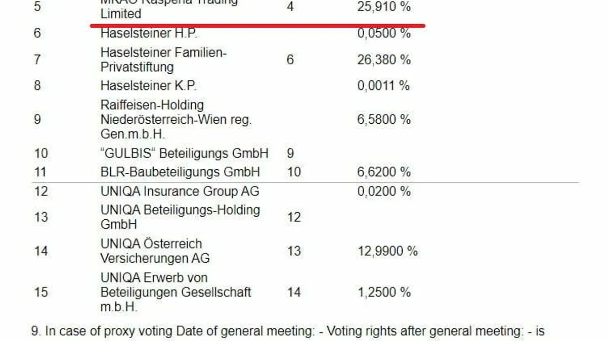 Acționarii grupului Strabag SE sunt: familia Haselsteiner, Raiffeisen și Uniqa Group și MKAO „Rasperia Trading Limited”. Ultima companie este deținută de oligarhul rus Oleg Deripaska, un apropiat al liderului de la Kremlin, Vladimir Putin.