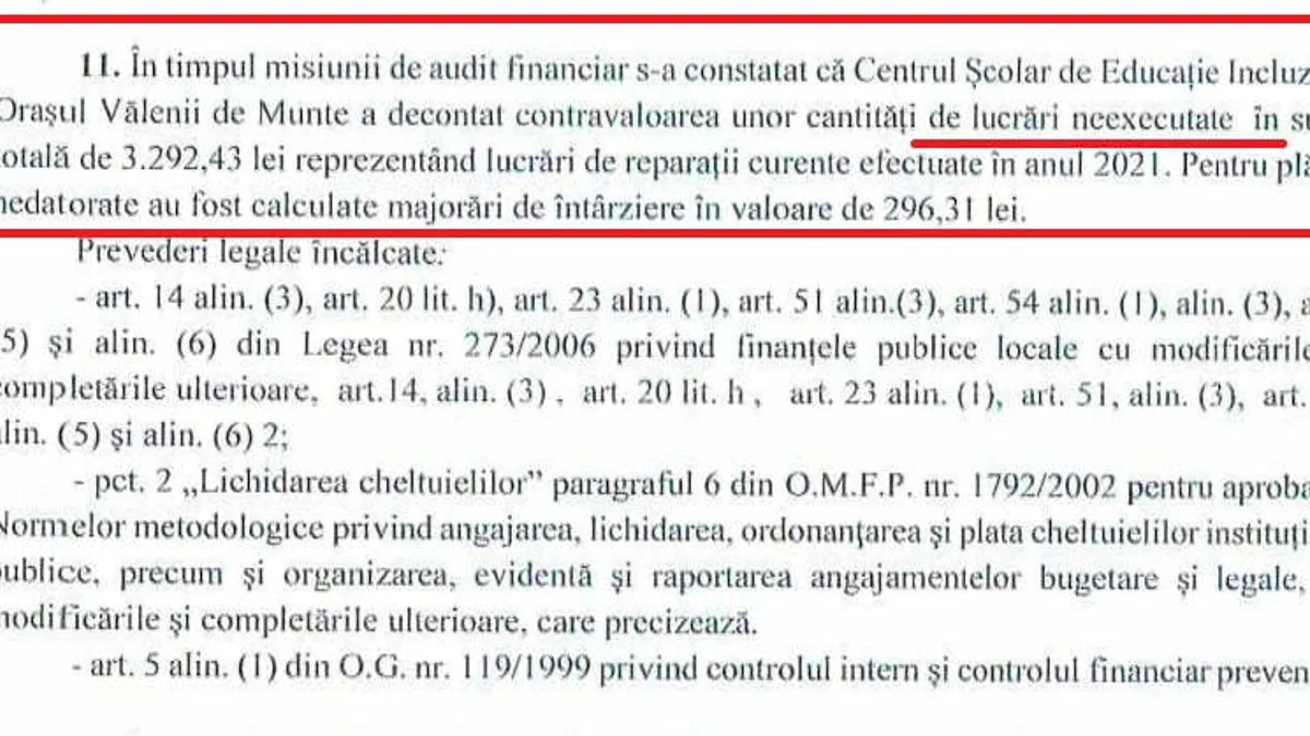În timpul misiunii de audit la Centrul Școlar de Educație Inclusivă, o unitate de învățământ special din Vălenii de Munte, s-a constatat că au fost decontate lucrări fictive în valoare de aproximativ 3.300 de lei. Culmea incompetenței, pentru această plată nedatorată s-au cerut penalități de întârziere de aproape 300 de lei.
