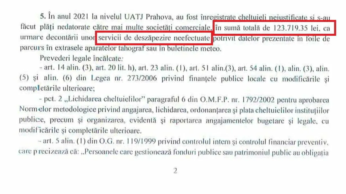 Prahova: deszăpezire fictivă de 25.000 euro. Consiliul Județean Prahova a plătit aproape 25.000 de euro pentru servicii de deszăpezire neefectuate. Într-un alt caz, pentru o altă lucrare fictivă s-au plătit chiar și penalități de întârziere a achitării banilor. Acestea sunt doar câteva dintre concluziile unui raport al Camerei de Conturi Prahova, care a constatat mai multe nereguli și ilegalități în gestionarea banilor publici.