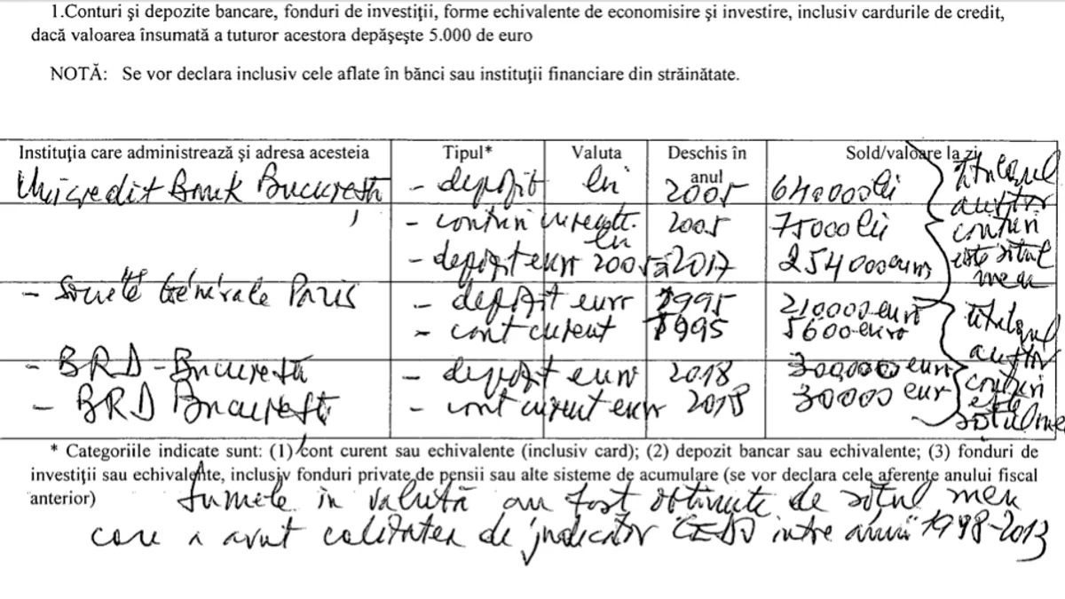 Astfel, au fost declarate conturi de 715.000 de lei (640.000+75.000) și aproape 800.000 de euro (254.000+210.000+5.600+300.000+30.000).