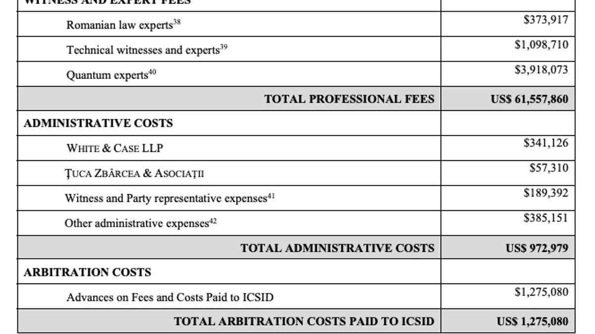 Potrivit documentului depus de Gabriel Resources la ICSID, profesorii de drept Corneliu Bîrsan, Lucian Mihai, Ovidiu Podaru și Ioan Schiau și alții au beneficiat de onorarii de aproape 374.000 de dolari.