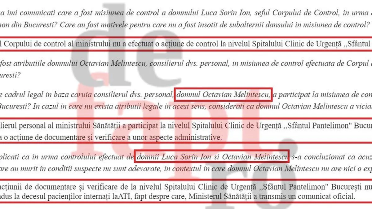 DeFapt.ro i-a solicitat ministrului Alexandru Rafila în data de 18 aprilie 2024 să comunice care a fost misiunea de control a lui Luca Sorin Ion, șeful Corpului de Control, la Spitalul "Sf. Pantelimon", dar și de ce acesta nu a fost însoțit de subalternii săi.