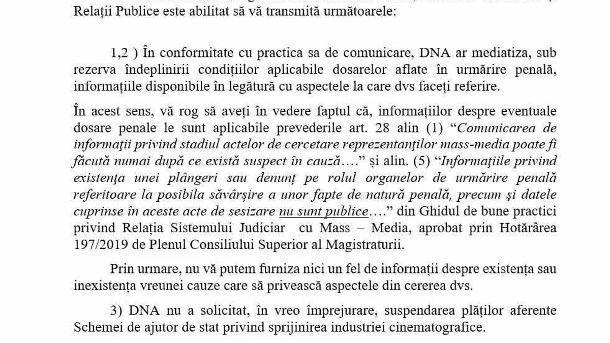 Direcția Națională Anticorupție a transmis oficial că nu poate furniza nici un fel de informații "despre existența sau inexistența vreunei cauze" care să privească schema de ajutor de stat privind sprijinirea industriei cinematografice.