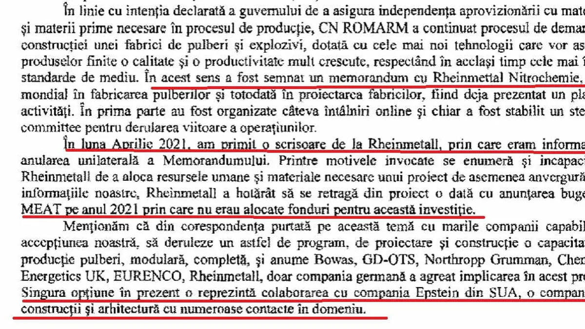 După ce s-a discutat cu toate marile companii capabile să construiască o instalație nouă de pulberi, fără succes, Romarm susține că „singura opțiune în prezent o reprezintă colaborarea cu compania Epstein din SUA, o companie de construcții și arhitectură cu numeroase contacte în domeniu”.