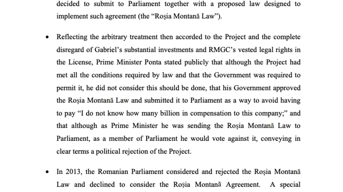 Conform cererii de arbitraj, "Reflectând tratamentul arbitrar acordat atunci Proiectului și nerespectarea investițiilor substanțiale ale Gabriel Resources și a drepturilor legale dobândite de RMGC prin Licență, prim-ministrul Ponta a declarat public că, deși Proiectul a îndeplinit toate condițiile cerute de lege și că Guvernul era obligat să să îl autorizeze, el nu a considerat că acest lucru trebuia făcut.
