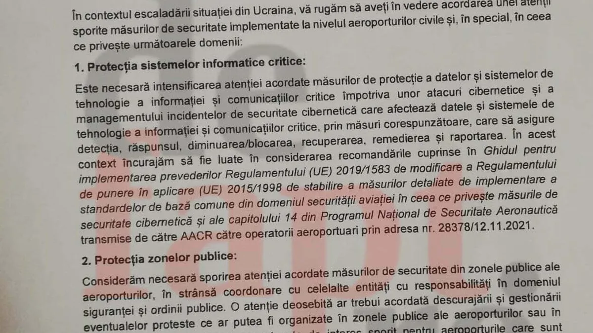 În contextul războiului ruso-ucrainean, directorul Nicolae Stoica a transmis o notă "urgentă" către toate aeroporturile din țară. Prin care a cerut să se acorde o "atenție sporită" măsurilor de securitate implementate la nivel aeroporturilor civile, dar și să ofere protecție informațiilor critice.
