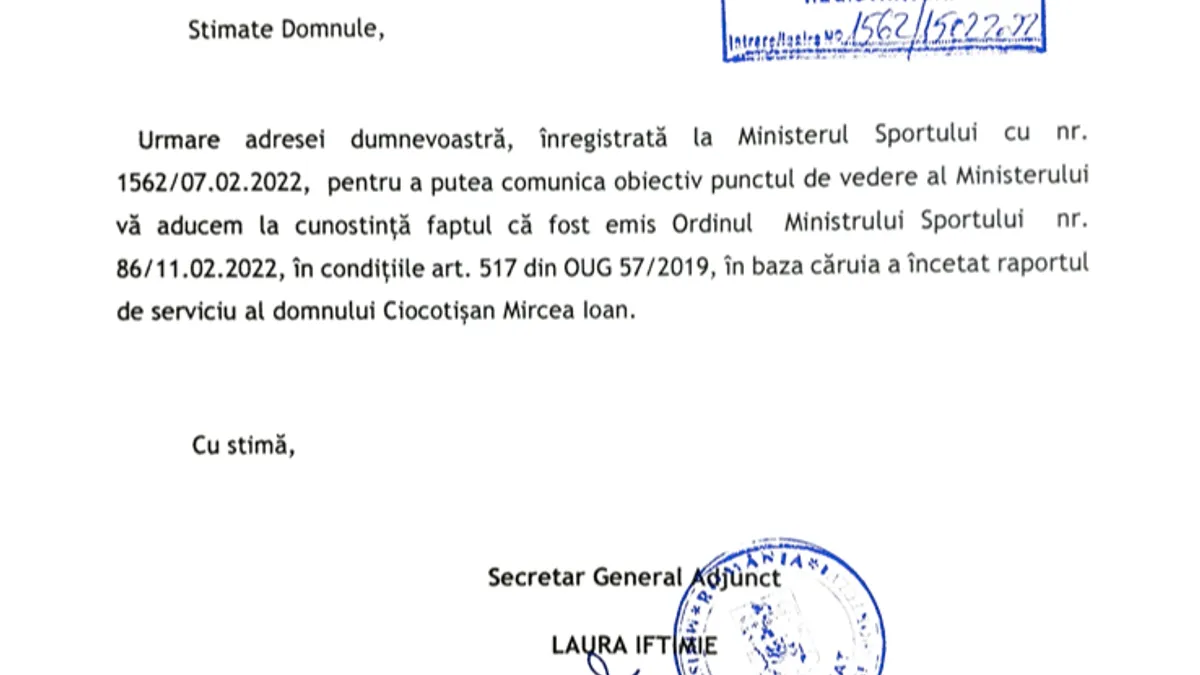 Ministerul Sporturilor, condus de Eduard Novak, în urma solicitării făcute de către Defapt.ro a transmis următoarele: „Vă aducem la cunoștință faptul că a fost emis Ordinul Ministrului Sportului nr. 86/11.02.2022, în condițiile art. 517 din OUG 57/2019, în baza căruia a încetat raportul de serviciu al domnului Ciocotișan Mircea Ioan”.