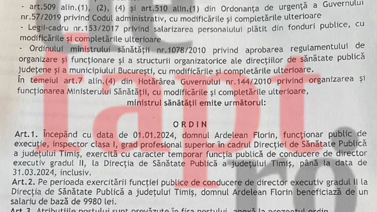 "Pe perioada funcției de conducere de director executiv gradul II la Direcția de Sănătate Publică a județului Timiș, domnul Ardelean Florin beneficiază de un salariu de bază de 9.980 lei", se menționează în decizia semnată de ministrul Alexandru Rafila.