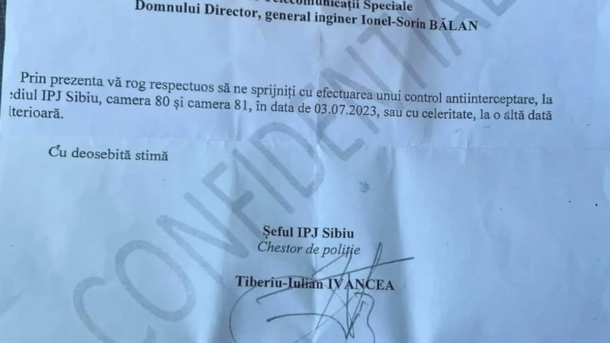 "Prin prezenta vă rog respectuos să ne sprijiniți cu efectuarea unui control antiinterceptare, la sediul IPJ Sibiu, camera 80 și 81, în data de 3.07.2023, sau cu celeritate, la o altă dată ulterioară", se menționează în documentul semnat de chestorul de poliție Tiberiu Iulian Ivancea.