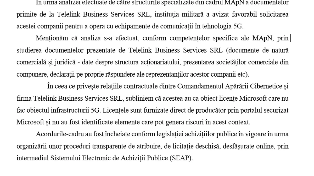 Totodată, Biroul de Presă al MApN a mai transmis că analiza s-a efectuat conform competențelor specifice ale MApN, prin studierea documentelor prezentate de Telelink Business Services SRL (documente de natură comercială și juridică - date despre structura acționariatului, prezentarea societăților comerciale din compunere, declarații pe proprie răspundere ale reprezentanților acestor companii etc).