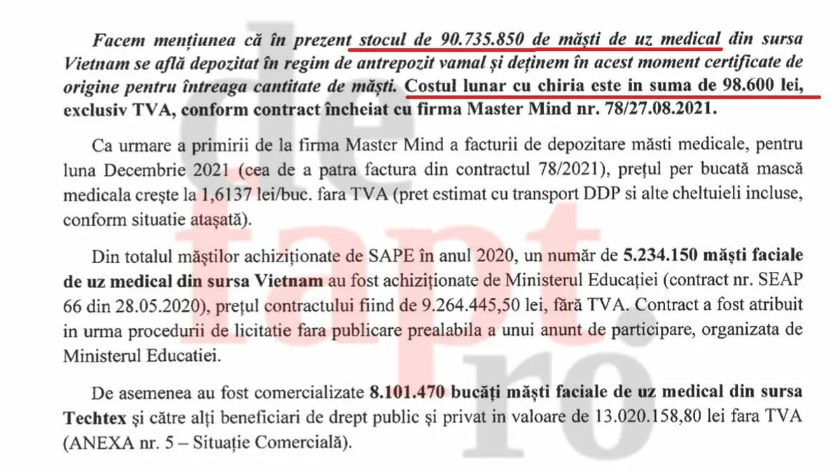 Un calcul simplu arată că SAPE a plătit în doi ani o chirie de peste două milioane de euro pentru depozitarea măștilor din Vietnam.