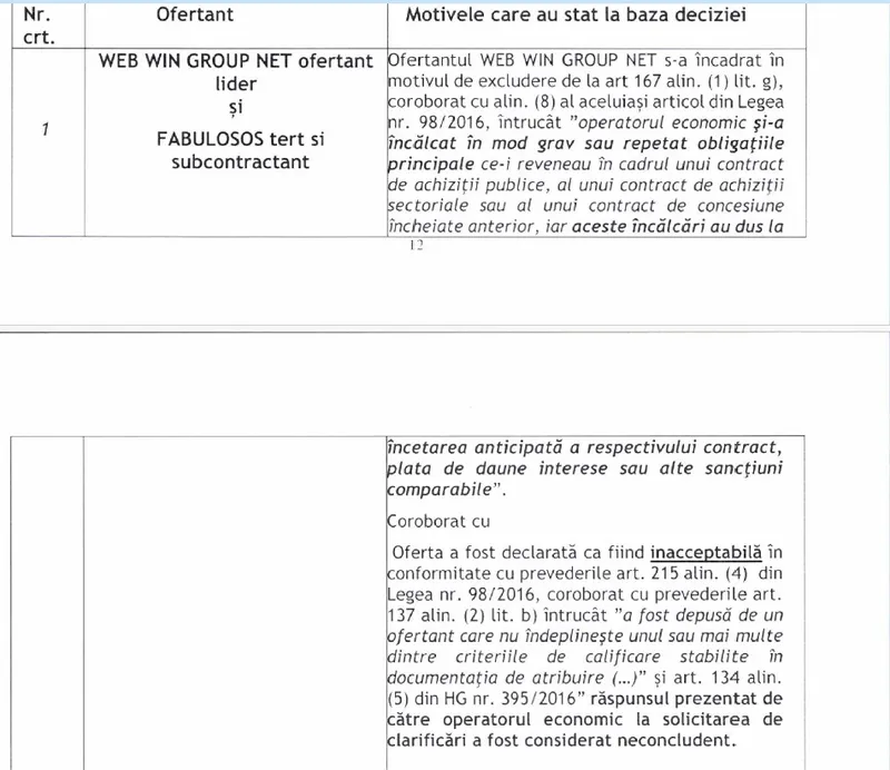 Comisia de evaluare a ofertelor a decis să excludă oferta Web Win Group Net pentru că aceasta „și-a încălcat în mod grav sau repetat obligațiile principale ce-i reveneau în cadrul unui contract de achiziții publice, al unui contract de achiziții sectoriale sau al unui contract de concesiune încheiat anterior, iar aceste încălcări au dus la încetarea anticipată a respectivului contract, plata de daune interese sau alte sancțiuni comparabile”.