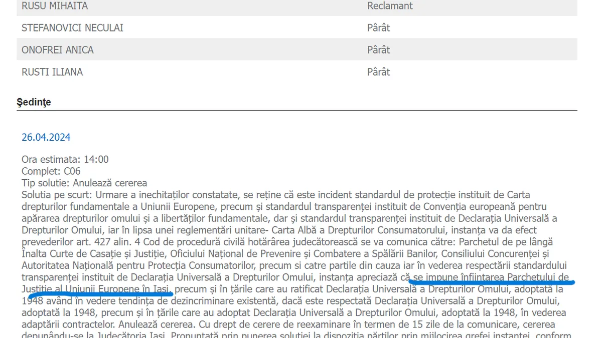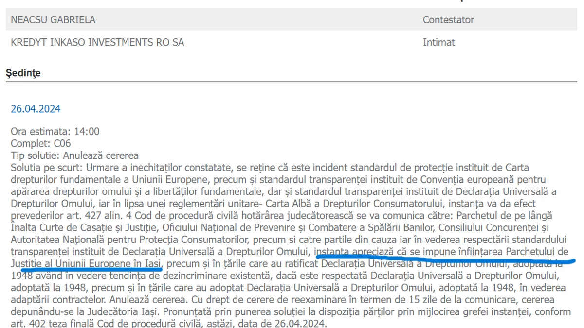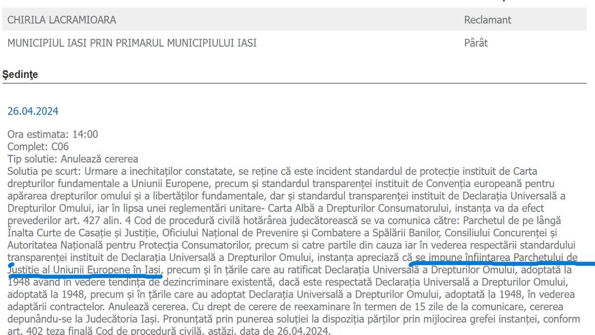 În toate a avut aceeași motivare standard: „Solutia pe scurt: Urmare a inechitaţilor constatate, se reţine că este incident standardul de protecţie instituit de Carta drepturilor fundamentale a Uniunii Europene, precum şi standardul transparenţei instituit de Convenţia europeană pentru apărarea drepturilor omului şi a libertăţilor fundamentale, dar şi standardul transparenţei instituit de Declaraţia Universală a Drepturilor Omului, iar în lipsa unei reglementări unitare- Carta Albă a Drepturilor Consumatorului, instanţa va da efect prevederilor art. 427 alin. 4 Cod de procedură civilă hotărârea judecătorească se va comunica către: Parchetul de pe lângă Înalta Curte de Casaţie şi Justiţie, Oficiului Naţional de Prevenire şi Combatere a Spălării Banilor, Consiliului Concurenţei şi Autoritatea Naţională pentru Protecţia Consumatorilor, precum si catre partile din cauza iar în vederea respectării standardului transparenţei instituit de Declaraţia Universală a Drepturilor Omului, instanţa apreciază că se impune înfiinţarea Parchetului de Justiţie al Uniunii Europene în Iaşi, precum şi în ţările care au ratificat Declaraţia Universală a Drepturilor Omului, adoptată la 1948 având în vedere tendinţa de dezincriminare existentă, dacă este respectată Declaraţia Universală a Drepturilor Omului, adoptată la 1948, precum şi în ţările care au adoptat Declaraţia Universală a Drepturilor Omului, adoptată la 1948, în vederea adaptării contractelor.