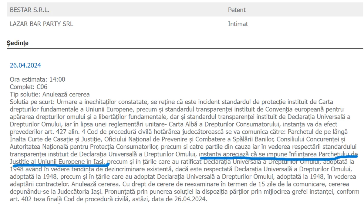 Ea este deja celebră pentru faptul că, la 15 aprilie, a amânat 44 de dosare invocând același motiv: „Solutia pe scurt: Având în vedere standardul transparenţei instituit de Declaraţia Universală a Drepturilor Omului proclamată de Adunarea Generală A Naţiunilor Unite la 10.12.1948, Convenţia Europeană a Drepturilor Omului, marja de apreciere recunoscută statelor, instanţa apreciază cauza în stare de amânare şi acordă termen de judecată la data de 14.10.2024, ora 10,00, pentru când se citează părţile cu menţiunea de a formula precizări cu privire la actele invocate, sub sancţiunea anulării cererii, prin raportare la art. 12 Cod de procedura civila”.