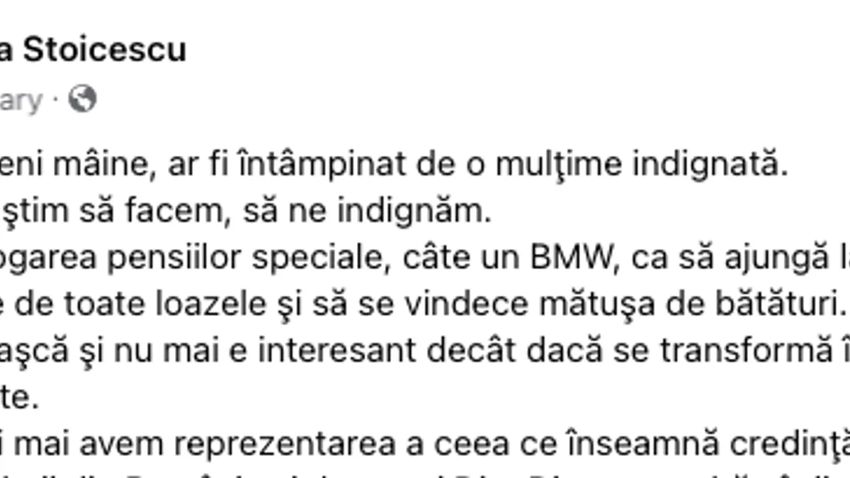 Într-o postare pe Facebook, Stoicescu îi pune în aceeași oală pe cei care cer abrogarea pensiilor speciale cu cei care vor lucruri ușoare și stupide.