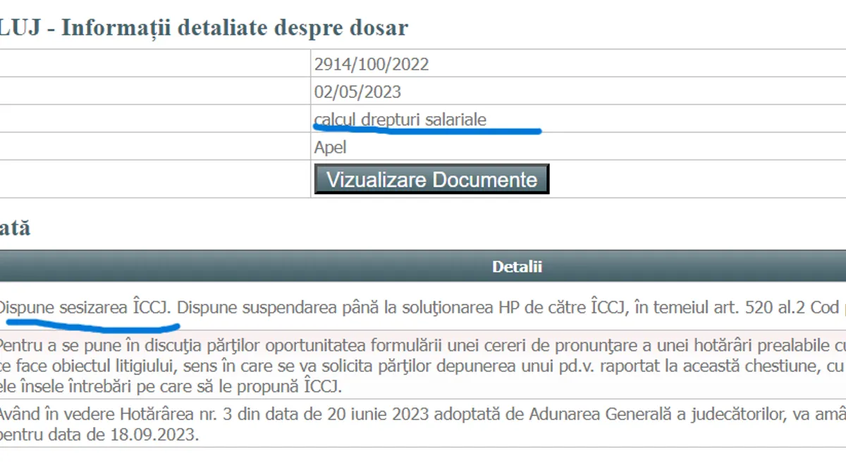 Însă, la Curtea de Apel Cluj, s-a decis, în octombrie 2023, sesizarea Înaltei Curți de Casație și Justiție (ÎCCJ): „Dispune sesizarea ÎCCJ. Dispune suspendarea până la soluţionarea HP de către ÎCCJ, în temeiul art. 520 al.2 Cod proc.civ.”.
