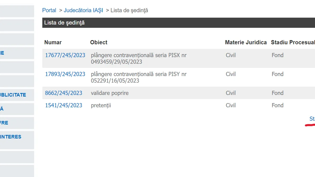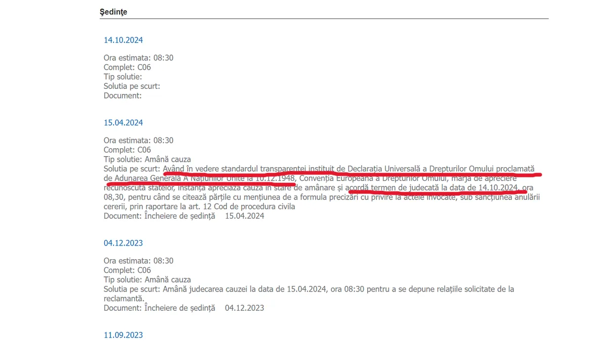 Deciziile au fost luate la 15 aprilie de judecătoarea Iuliana Garabet de la Judecătoria Iași. Așa cum se vede pe portalul instanțelor, deciziile de amânare sunt perfect identice, exceptând data la care se amână procesul.