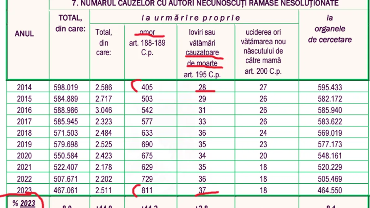 Numărul omorurilor nerezolvate s-a dublat în 10 ani, arată raportul pe 2023 al Ministerului Public. În 2014, Parchetul General raporta 405 cazuri de omoruri cu autor necunoscut „rămase nesoluționate”. În 2022 erau 729 de cazuri, în 2023 se ajunsese la 811.