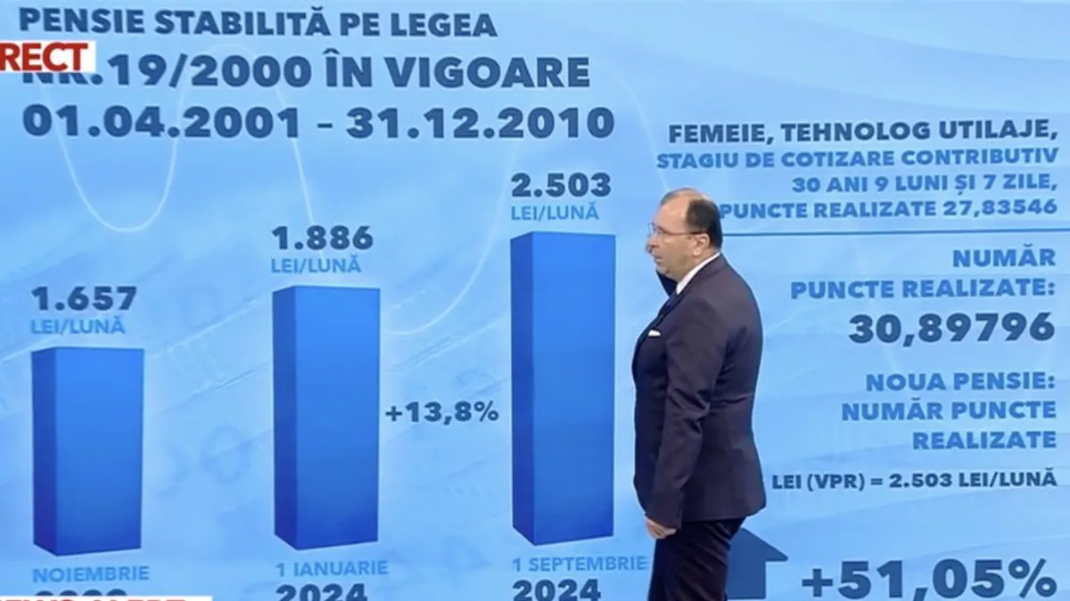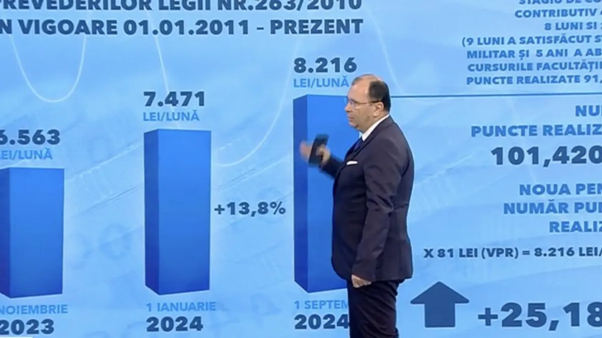 Principalul invitat, Daniel Baciu, a prezentat grafice cu creșterile de pensii și a nunțat majorări spectaculoase. „Profesor, cu stagiu de cotizare de 44 de ani, 8 luni și 22 de zile, cu 91 de puncte realizate: pensia va ajunge la 7.471 de lei/lună la 1 ianuarie 2024, iar de la 1 septembrie va ajunge la 8.216 lei/lună”, a spus Baciu. Un alt exemplu oferit de acesta a fost al unei „femei, tehnolog utilaje” cu 30 de ani și nouă luni de cotizare, a cărei pensie va sări de la 1.657 de lei la 2.503 lei, la finalul anului 2024, majorarea fiind de peste 51%.