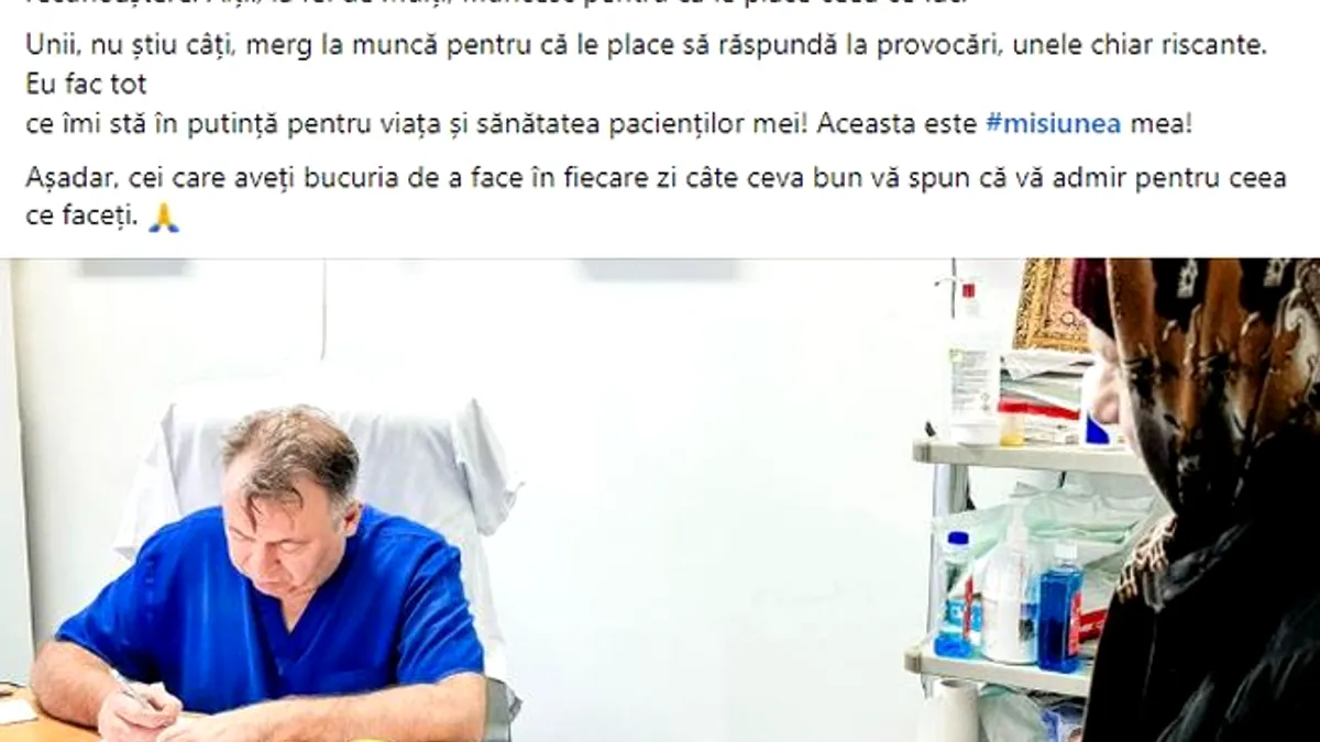În multe domenii de activitate, mulţi oameni muncesc doar pentru partea financiară sau recunoaştere. Alţii, la fel de mulţi, muncesc pentru că le place ceea ce fac. Unii, nu ştiu câţi, merg la muncă pentru că le place să răspundă la provocări, unele chiar riscante. Eu fac tot ce îmi stă în putinţă pentru viaţa şi sănătatea pacienţilor mei! Aceasta este misiunea mea! Aşadar, cei care aveţi bucuria de a face în fiecare zi câte ceva bun vă spun că vă admir pentru ceea ce faceţi”, a scris Tătaru.