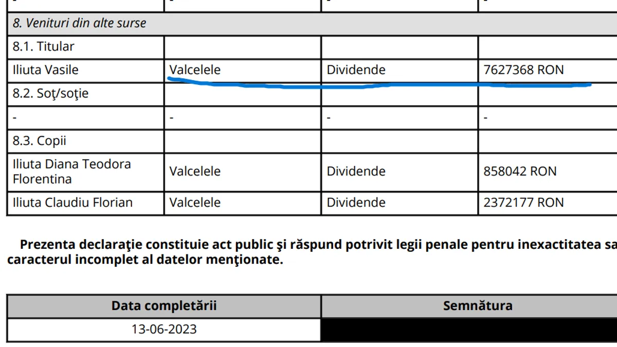Sumele încasate sub formă de dividende sunt uriașe: 7,6 milioane de lei pentru președintele CJ și 3,2 milioane de lei de doi dintre copiii săi. În declarația de avere din 2022, dividendele de la această asociație au fost de circa trei milioane de lei, iar în 2021 tot circa trei milioane de lei.
