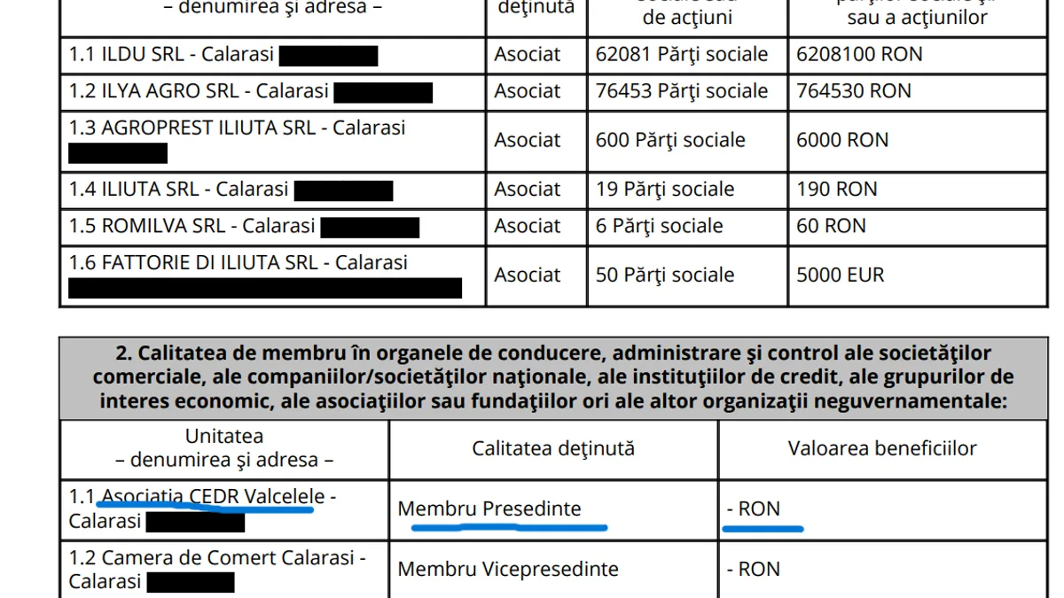 În declarația de avere depusă de Iliuță în 2023, figurează doar „dividende” Vâlcele, fără să fie clar trecută denumirea firmei. Însă, în declarația de interese, președintele Consiliului Județean Călărași figurează ca președinte al Asociației CEDR Valcelele.