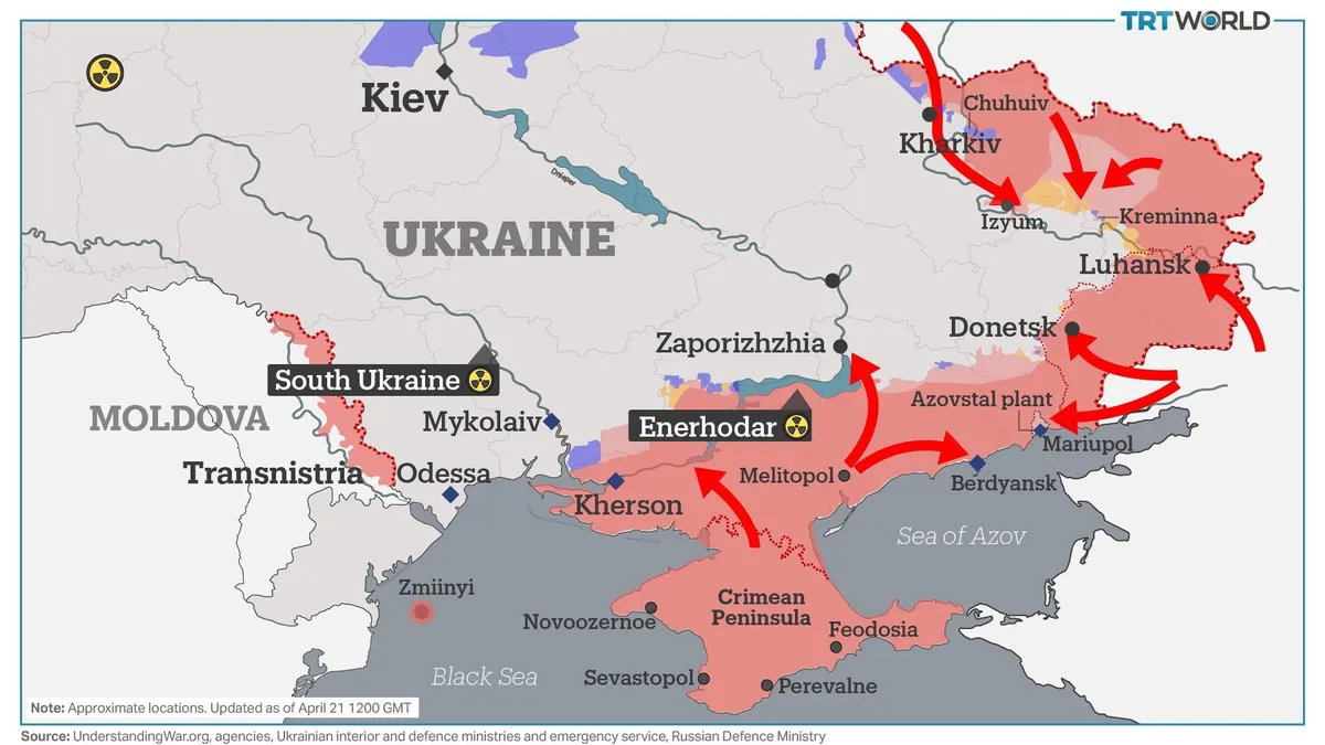 „Forțele ruse ar putea desfășura «acțiuni de provocare» în regiunea separatistă Transnistria din Moldova pentru a acuza Ucraina de agresiune împotriva unui stat vecin”, avertiza, la 11 aprilie, comandamentul trupelor ucrainene.