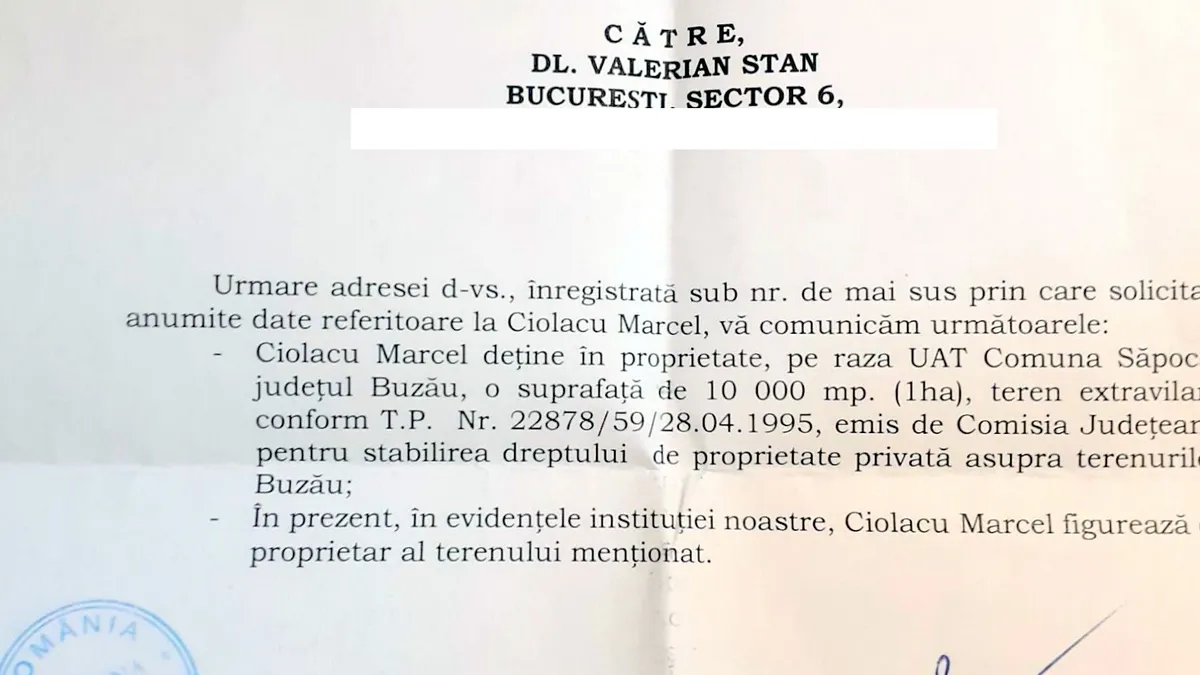 Președintele PSD, Marcel Ciolacu, ar deține un hectar la Săpoca, în Buzău, primit în calitate de revoluționar, dar terenul nu figurează în declarația de avere. Informația apare într-o adresă a primăriei Sapoca către Valerian Stan, candidatul PNȚMM la președinția României.