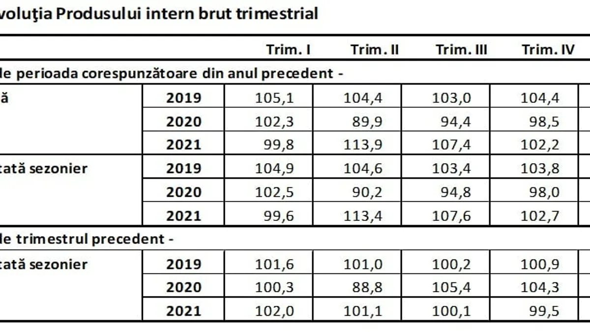 "Produsul Intern Brut în trimestrul IV 2021 a fost, în termeni reali, mai mic cu 0,5% comparativ cu trimestrul III 2021. Faţă de acelaşi trimestru din anul 2020, Produsul Intern Brut a înregistrat o creştere cu 2,2% pe seria brută şi cu 2,7% pe seria ajustată sezonier.