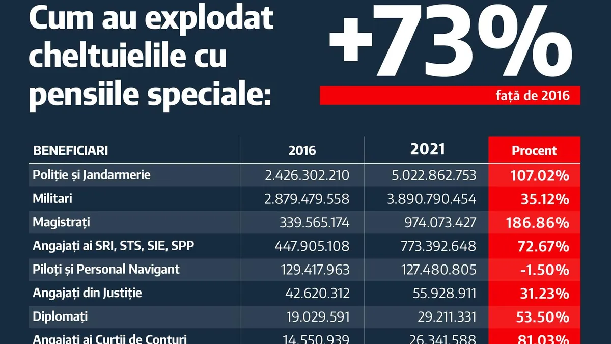 Potrivit deputatului USR Claudiu Năsui, aceste cheltuielie au crescut cu 73% față de 2016. Astfel, în 2021, se plăteau pentru pensiile speciale 10,9 miliarde de lei. În 2016, bugetul aloca doar 6,32 miliarde de lei pentru această cheltuială.