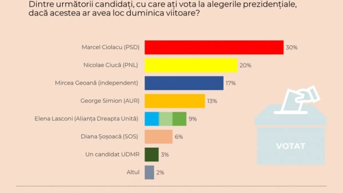 În același sondaj, George Simion, primul candidat anunțat oficial la prezidențiale, se află la 13%.