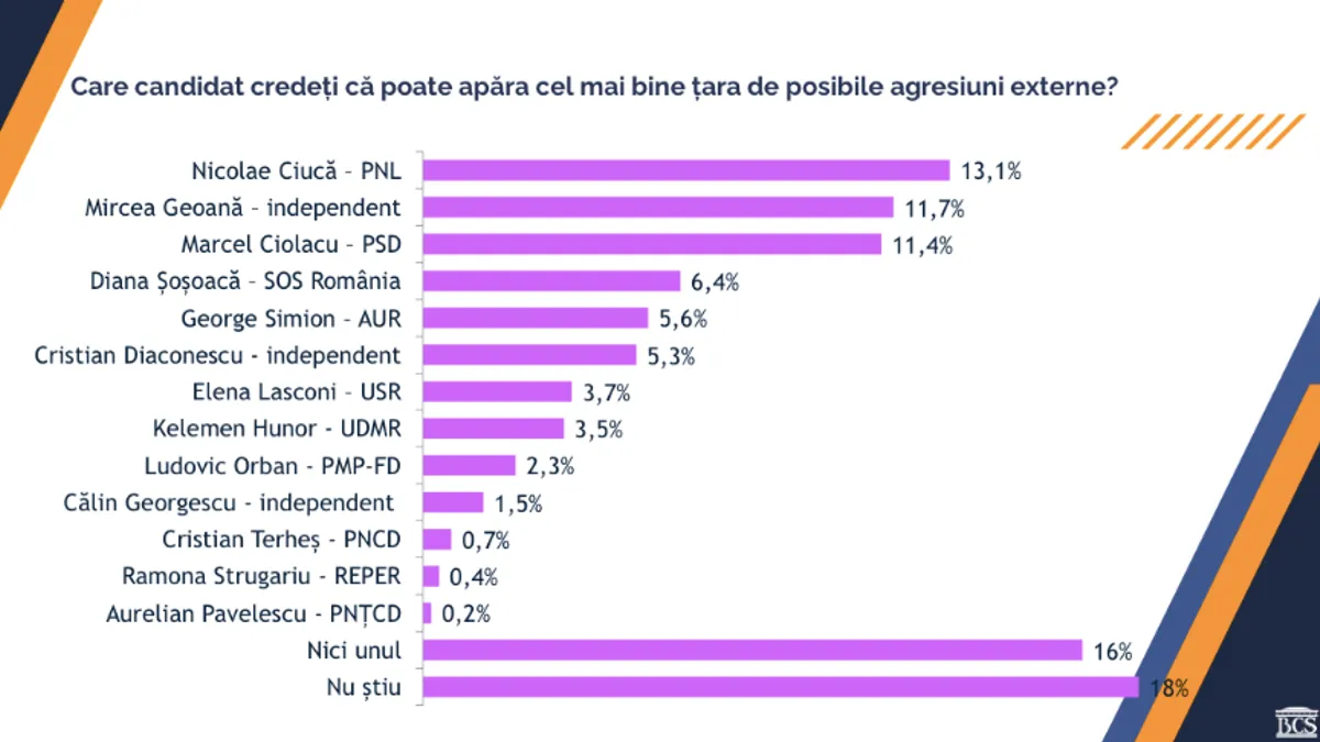În ce privește capacitatea de apăra cel mai bine țara de agresiuni externe, Ciucă a ieșit pe locul întâi, cu 13,1% din opțiuni, urmat de Mircea Geoană (11,7%) și Marcel Ciolacu (11,4%).