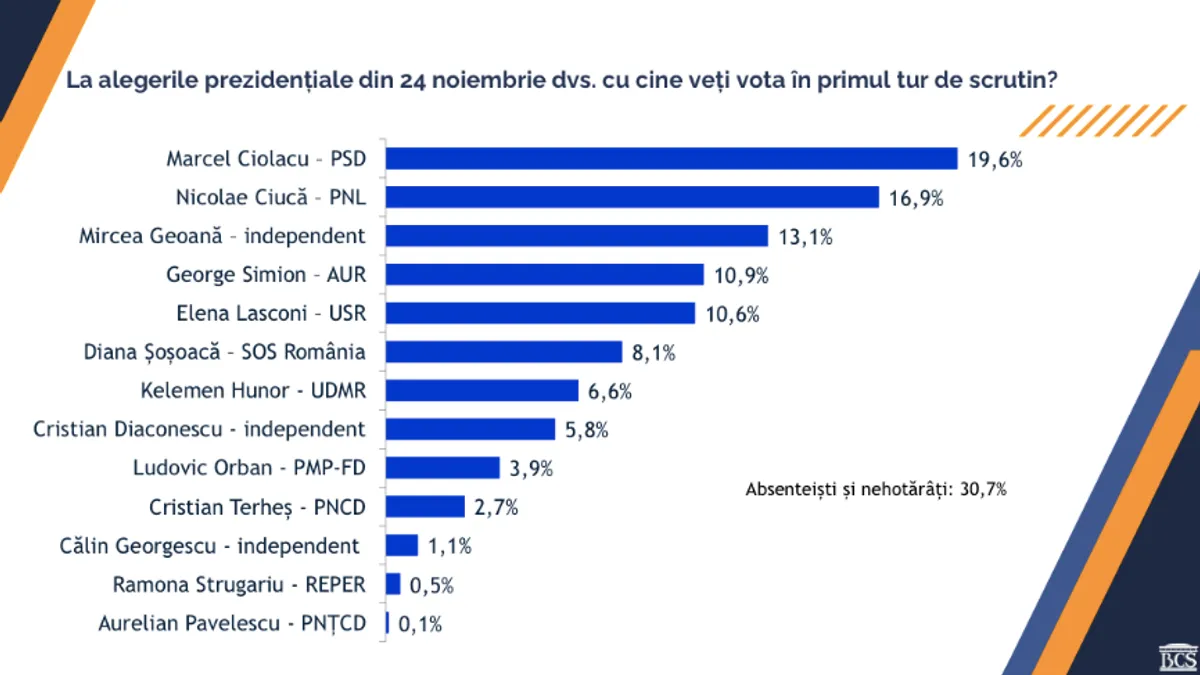 Primul, arată sondajul, ar avea 19,6% din opțiunile de vot, al doilea - 16,9%.